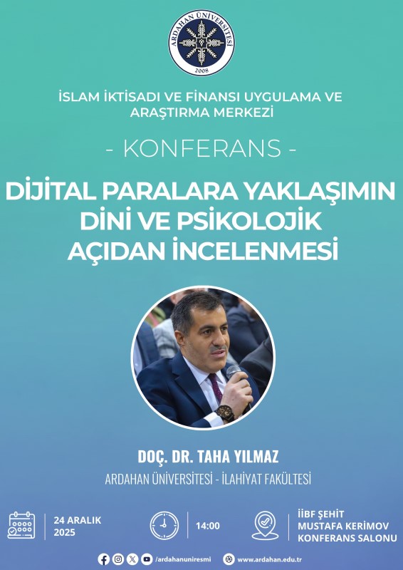 Bölümümüz akademik personellerinden Dr.Öğr.Üyesi Gökay KARADUMAN'ın müdürlüğünü yaptığı Üniversitemiz "İslam İktisadi ve Finansı Uygulama ve Araştırma Merkezi" tarafından 24.12.2025 tarihi için organize edilen Konferansımıza tüm öğrencilerimiz ve personelimiz davetlidir. Üniversitemiz İlahiyat Fakültesi Öğretim Üyesi Doç.Dr. Taha YILMAZ tarafından verilecek konferansta "Dijital Paralara Yaklaşımın Dini ve Psikolojik Açıdan İncelenmesi" konusu ele alınacaktır.